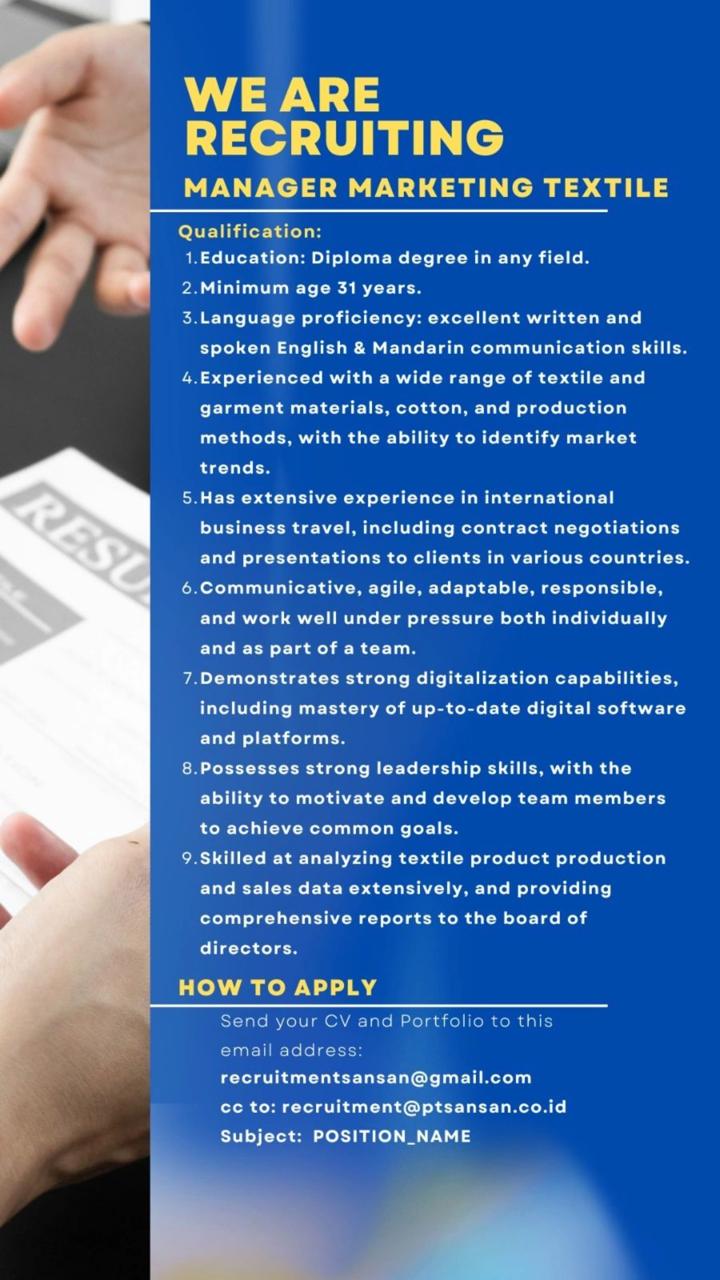 - Berpengetahuan luas tentang bahan tekstil dan garmen, katun, dan metode produksi; mampu melihat tren pasar.